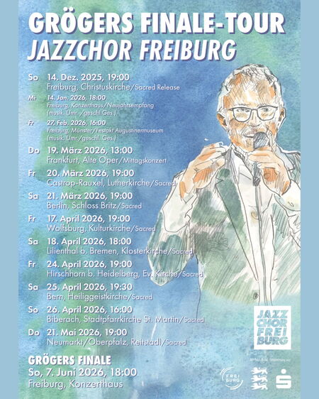 On Sunday, June 7, 2026, with a farewell concert we will celebrate with Bertrand Gröger and the Jazzchor Freiburg in the Konzerthaus Freiburg.